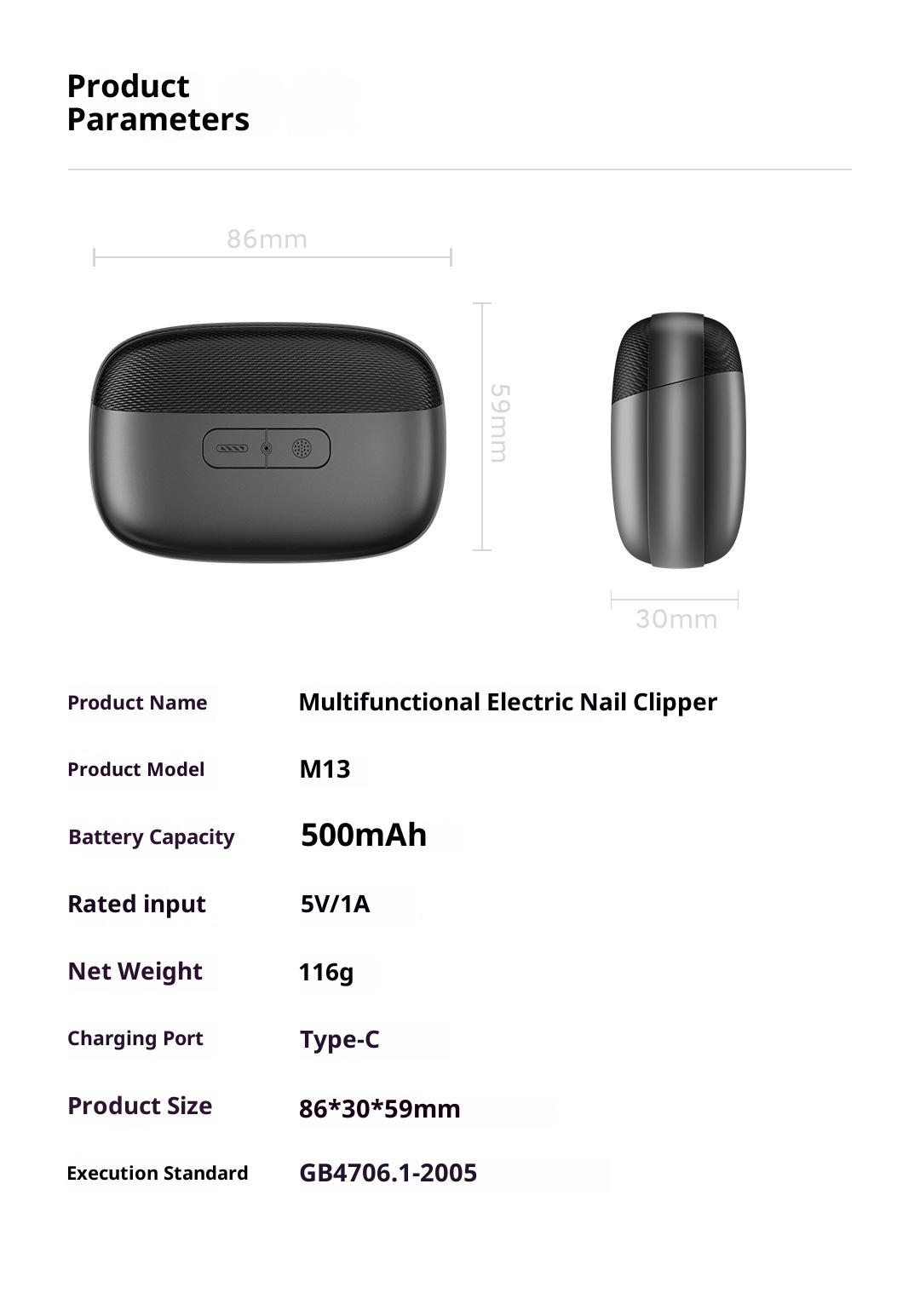 Package list: electric nail clipper, instructions, charging cable, replaceable grinding head